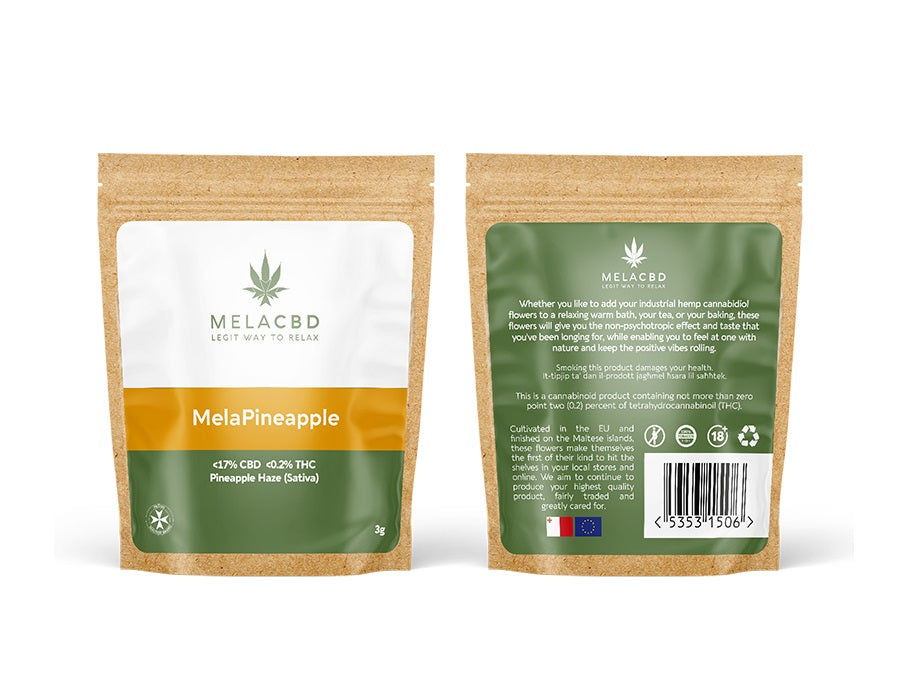 Mela Pineapple strain levels are at <17% CBD and <0.2% THC.
